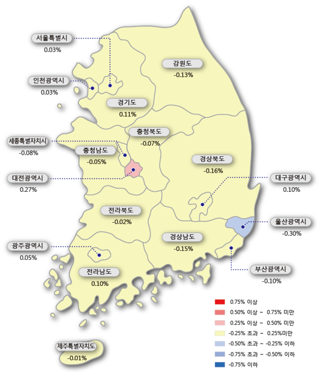 거래감소뿐 아니라 가격 상승세도 주춤하다. 한국감정원에 따르면 10월 4째 주(22일 기준) 전국 아파트 매매가격은 0.01% 상승, 전세가격은 0.01% 하락했다. 매매가격은 7주 연속 상승폭이 줄고 있으며 서울 역시 0.03% 상승해 주춤하고 있다.