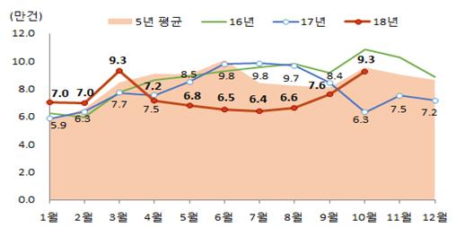 ▲2014년 14만7000건 ▲2015년 13만9000건 ▲2016년 14만4000건 ▲2017년 12만1000건 등 15만건이 넘지 않았다가 올 들어 처음으로 15만건을 넘어섰다. 올 들어 10월까지 누적 전월세 거래량도 153만5000건으로 전년 동기 대비 8.8% 증가했다.