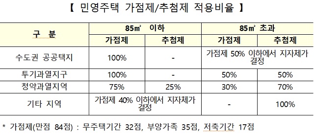 우선 민영주택 추첨제 대상의 75% 이상을 무주택자에게 우선 공급한다. 투기과열·청약과열지구와 수도권·지방광역시에서 분양하는 민영주택이 대상이다. 잔여 주택은 무주택자와 1주택 실수요자에게 돌아가고 남는 주택이 있는 경우 1순위에 공급된다.