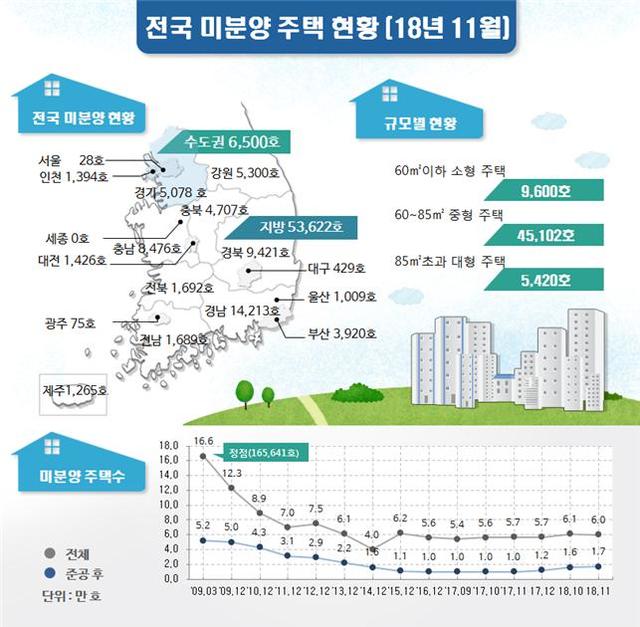 지역별로 전체 미분양 물량을 보면 수도권의 미분양은 6500가구로 전월(6679가구) 대비 2.7%(179가구) 줄었다. 지방 역시 5만3622가구로 0.4%(201가구) 감소했다.