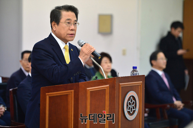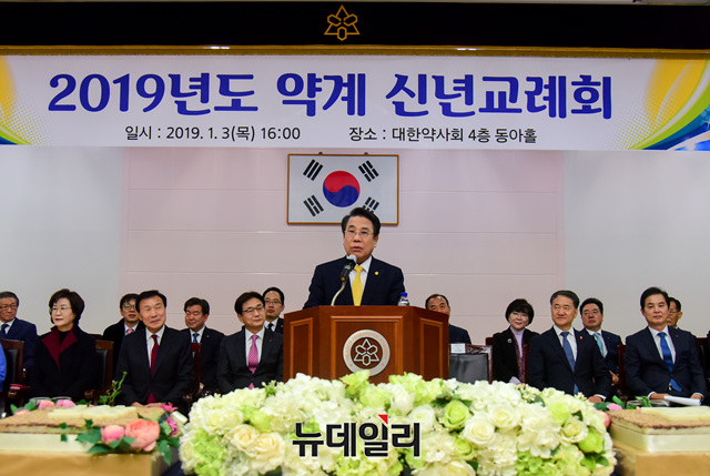 조찬휘 대한약사회장이 3일 오후 서울 서초구 대한약사회관에서 열린 '2019년도 약계 신년교례회'에서 축사를 하고 있다.