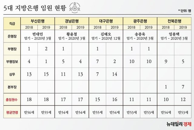 지방은행 핵심 임원진이 50대 초반의 상무와 본부장 자리로 채워지고 있다.시중은행의 임원 평균 연령이 만 55세인 데 반해 지방은행의 경우 만 53세로 약 2년 더 빨리 진급한 것으로 나타났다.30일 부산, 경남, 대구, 광주, 전북 등 5대 지방은행의 임원 현황을 분석한 결과 올해 총 임원 74명 중 49명이 상무 및 본부장인 것으로 조사됐다.이는 1년 사이(지난해 1분기 기준) 17명 늘어난 것으로, 능력 있는 젊은 인재를 영입하는 데 집중한 것을 엿볼 수 있다. 전체 임원 수도 올해 3명 더 확대됐다.반면 부행장은 1년 사이 4명에서 3명으로, 부행장보는 35명에서 22명으로 줄었다.기존에도 부행장은 은행별 1~2명에 불과했지만 올해 유독 부행장보 자리를 확 줄이고 상무 및 본부장 역할에 힘을 더 실은 것이다.이는 부행장 역할이 더 큰 시중은행과도 다른 행보다. 올해 시중은행의 전체 임원 103명 중 부행장 및 부행장보는 56명, 전무 및 상무는 47명이다.지방은행 임원들의 평균 연령도 매년 낮아지는 추세다. 특히 시중은행보다 젊어진 점이 눈에 띈다.올해 시중은행의 임원 평균 연령은 1963년생(만55세)으로, 지방은행의 경우 1965년생(만53세)이 주를 이뤘다.은행별 임원 현황을 살펴보면 지난 1년간 임원진 구성에 가장 큰 변화가 있던 곳은 대구은행과 전북은행이다.대구은행의 경우 부행장보를 7명에서 2명으로 축소하는 대신 상무를 7명에서 14명으로 대폭 확대했다.앞서 김태오 DGB금융지주 회장이 지난해 4월 취임한 직후 조직 쇄신을 위해 대규모 인사를 단행, 지난해 말에는 5명의 신규 임원을 또 선임했다.5대 은행 중 유일하게 본부장을 임원으로 둔 전북은행은 지난해 1명이던 6명을 신규 선임했다. 반면 부행장보는 임기 만료 8명 중 4명은 퇴임하고 총 5명만 남게 됐다.부산은행의 경우 5대 은행 중 가장 많은 18명의 임원을 보유하고 있다. 부행장도 기존 성동화 부행장과 함께 안감찬 부행장보가 부행장으로 승진하면서 2명이 됐다.경남은행은 올해 부행장 자리를 없애는 대신 상무 7명을 대거 영입했다. 총 임원 수는 17명으로 지난해와 같다.5대 은행 중 유일하게 1년 동안 임원 변화가 없는 곳은 광주은행이다. 조직 안정에 방점을 찍으며 임원진을 유지하는 모양새다.총 임원 11명 중 부행장 1명과 부행장보 7명이 지난해 말 또는 오는 3월 임기 만료지만 모두 연임했다.은행권 관계자는 "올해 지방은행은 시중은행처럼 임원진의 보직 개편 이동보다 신규 선임에 더 방점을 찍은 것으로 보인다"며 "임원진 구성도 시중은행보다 점점 젊어지면서 50대 초반 임원이 주도권을 잡아가고 있다"고 말했다.