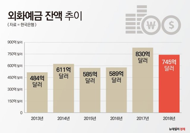 외화예금 잔액 745억 달러…전년比 85억↓2017년 830억 달러 최대치 찍은 후 하락세원·달러 환율 영향 커…달러화 가치 떨어져