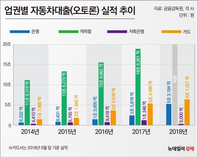 18일 여신금융협회 통계자료에 따르면 자동차할부금융 시장 규모는 점차 커지고 있다. 2017년 캐피탈업계 자동차할부금융 시장의 거래 금액 규모는 18조5361억 원으로 집계됐다. 은행, 카드, 저축은행까지 포함하면 자동차 대출시장은 27조원에 달하는 것으로 나타났다.은행권에서는 KB국민은행, 신한은행, KEB하나은행, 우리은행 등 4대 은행의 지난해 오토론 규모는 5조3184억원로 전년의 2조5878억원 대비 2배 이상 커졌다.