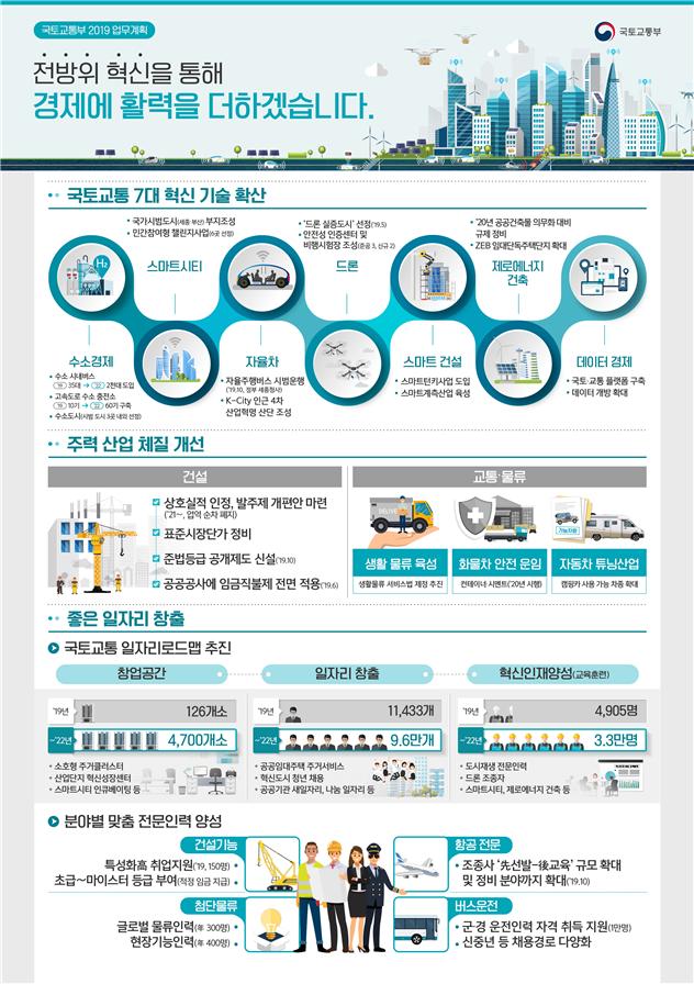 스마트 건설기술 활성화를 위해 스마트 턴키사업을 도입하고 도시재생뉴딜사업 구역 안에 제로에너지 마을을 조성하는 등 공공 주도로 제로에너지건축을 확산한다.국토부는 올해도 국토교통 분야에서 좋은 일자리 창출을 이어나간다는 방침이다. 국토부 산하 23개 공공기관 소속 약 6500명을 정규직으로 전환하고 '국토교통일자리 로드맵'의 집행과 보완도 철저히 할 계획이다.
