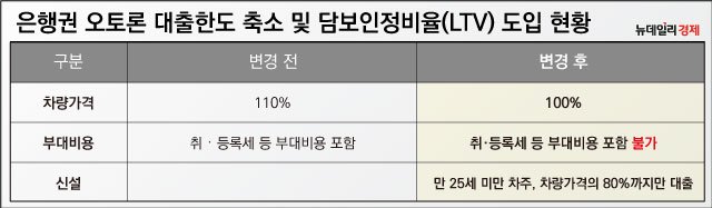 은행들은 이미 지난달부터 오토론 대출한도를 조이고, 연령에 따라 대출액을 제한했지만 실효성은 미미하다는 지적이 나오는 상황이다.