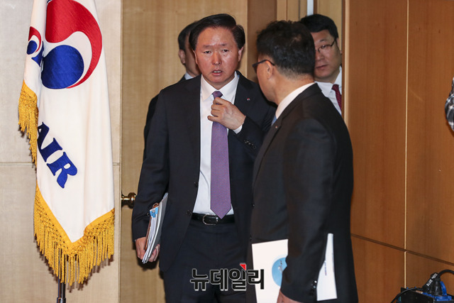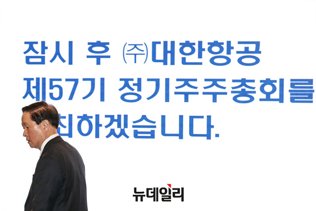 우기홍 대한항공 대표이사가 27일 오전 서울 강서구 대한항공 본사에서 열린 제57기 주주총회에 입장하고 있다.