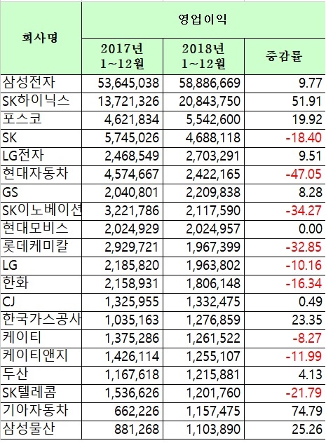 삼성전자와 SK하이닉스의 영업이익은 각각 58조8000억원과 20조8000억원으로 두회사의 영업이익은 전체 상장사의 절반이 넘는 50.56%를 차지했다.