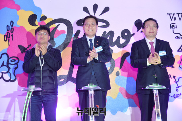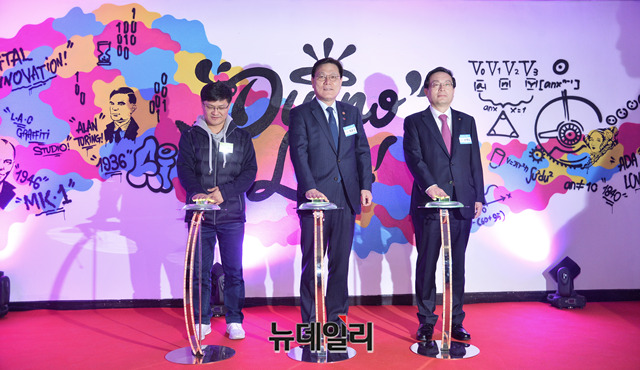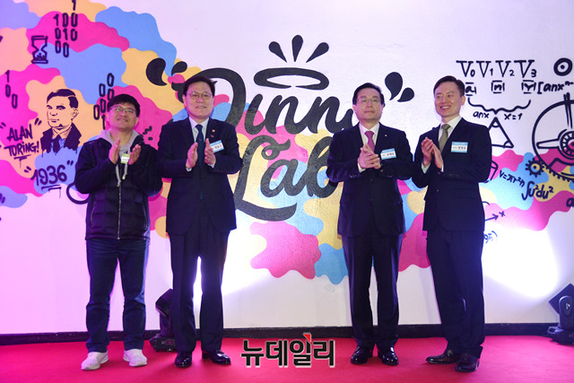 최종구 금융위원장, 손태승 우리금융그룹 회장이 3일 서울 여의도 우리은행 한화금융센터에서 열린 '디노랩(디비털 이노배이션 랩)' 개소식에 참석해 벽화 앞에서 기념촬영을 하고 있다.