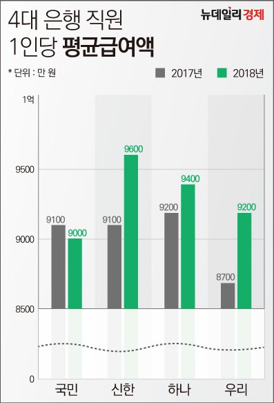 같은 기간 KEB하나은행도 200만원이 올라 지난해 9400만원의 평균 급여액을 기록했다. 반면 국민은행은 1년 새 100만원이 올라 지난해 9000만원을 기록, 4위에 머물렀다.