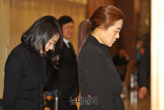 조현아 전 대한항공 부사장과 조현민 전 전무가 13일 오전 서울 서대문구 신촌세브란스병원 장례식장에서 故조양호 한진그룹 회장의 입관식 절차를 마친 뒤 빈소로 향하고 있다. 지난 8일 미국 LA에서 별세한 조 회장의 장례는 한진그룹 회사장으로 5일간 치러진다.