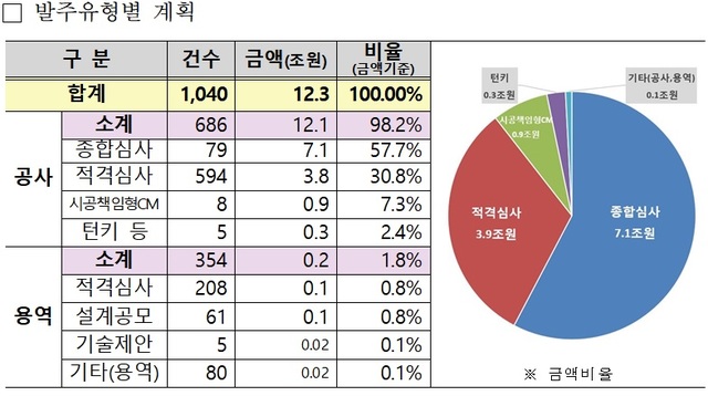 유형별로 공사부문에서 ▲종합심사 79건 7조1000억원 ▲적격심사 594건 3조8000억원 등 10조9000억원, 용역부문에서 ▲적격심사 208건 1000억원 ▲설계공모 61건 1000억원 등 2000억원을 발주할 계획이다.