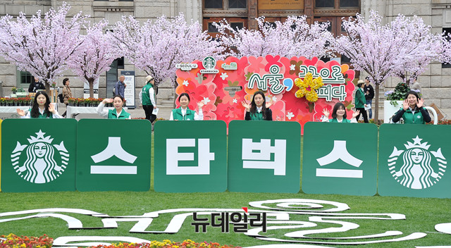 스타벅스코리아가 29일 오전 서울 중구 서울광장에서 '서울, 꽃으로 피다' 친환경 캠페인을 열고, 꽃이 그려진 우산을 활용해 환경 사랑 메시지를 전달하는 퍼포먼스를 하고 있다.