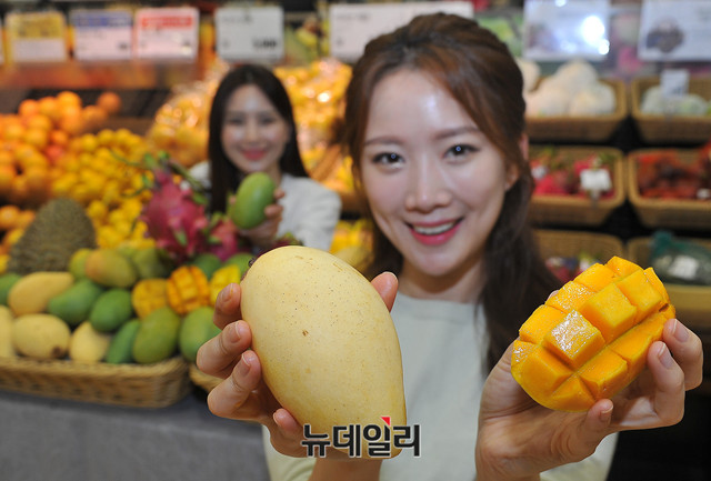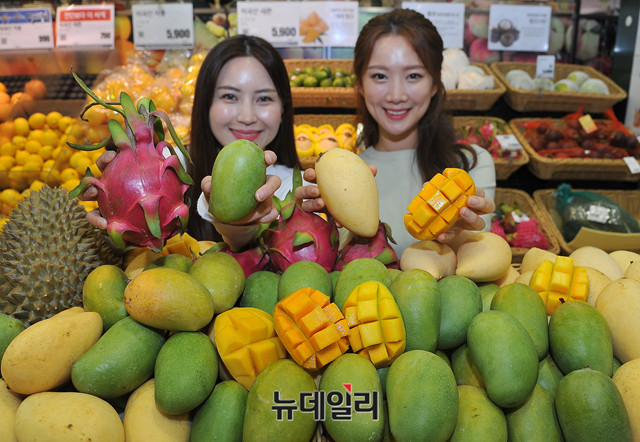 롯데마트가 30일 오전 서울 중구 롯데마트 서울역점에서 열대과일 4종(베트남 망고, 인도 망고, 태국산 두리안, 베트남 용과)을 선보이고 있다.이번에 선보인 '베트남 망고'는 베트남 메콩강 하류의 비옥한 지역에서 생산된 망고로 표면에 깨알 같은 점이 있다. 이외에도 초록색 과피에 황금빛 과육의 '인도 케사르 망고', 특유의 향과 달콤한 맛이 특징인 '두리안', 용의 여의주를 닮은 형태의 '용과'도 함께 판매된다.5월 2일부터 9일까지 '베트남 망고(2입1팩 / 7,900원)', '인도 망고(4~6입 1팩 / 9,900원)', '태국산 두리안(100g / 1,560원)', '베트남 용과(1개 / 3,000)'원에 판매한다.