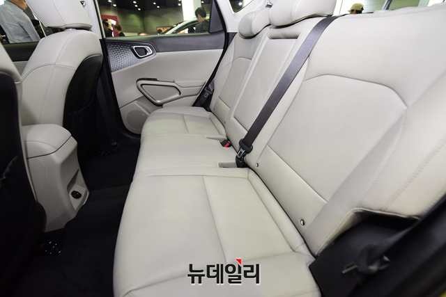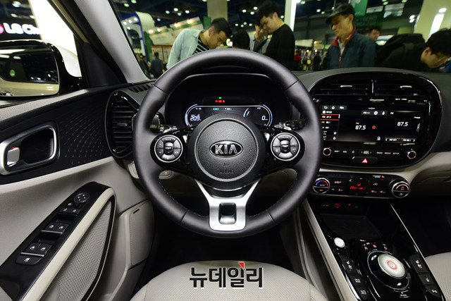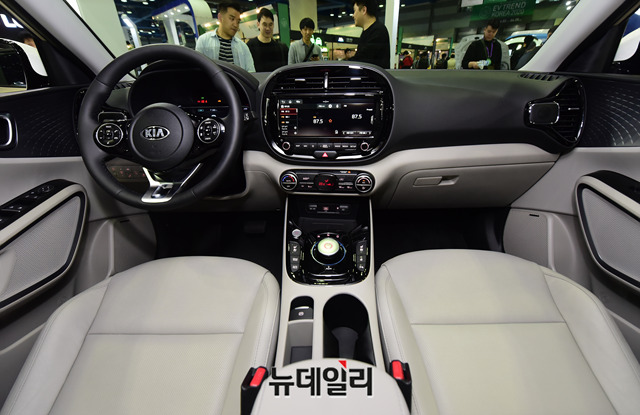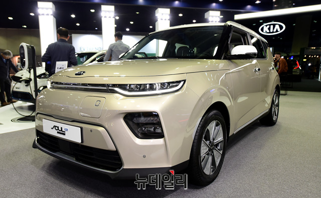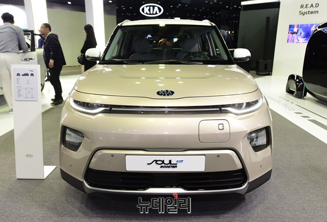 기아자동차가 2일 오후 서울 강남구 코엑스에서 열린 'EV 트렌드 코리아2019'에서 전기차 '쏘울 부스터 EV'를 선보이고 있다. 쏘울 부스터 EV는 미래 지향적인 외관 디자인과 하이테크한 이미지의 실내 공간을 갖춘 차량으로, 1회 충전에 386km를 주행할 수 있다.