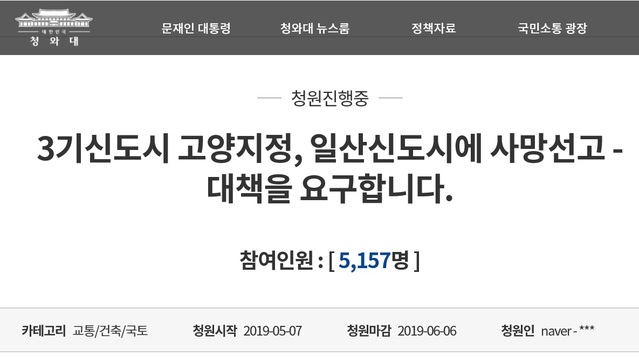 지난 7일 청와대 국민청원 및 제안사이트에는 3기 신도시 지정을 반대하는 청원 글이 잇따라 게재됐다. 특히 '일산신도시에 사망선고'라는 글에는 하루새 5000명이 넘는 사람들이 동의했다.