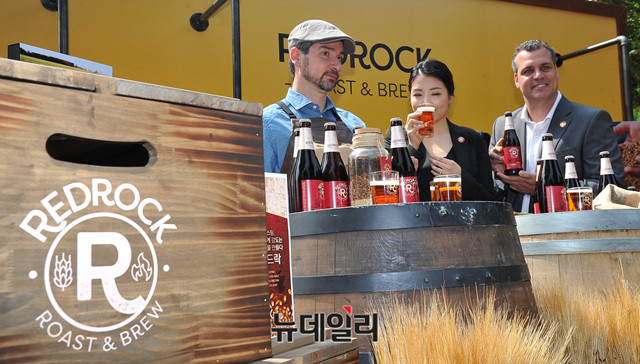 • 서혜연 레드락 마케팅 총괄 이사, 하파엘 피자토 총괄 대표, 로스트마스터 피에르 칸토(왼쪽부터)가 9일 오전 서울 용산구 그랜드하얏트 서울 워터폴가든에서 프리미엄 엠버라거 '레드락' 500ml 병제품을 선보이고 있다.
