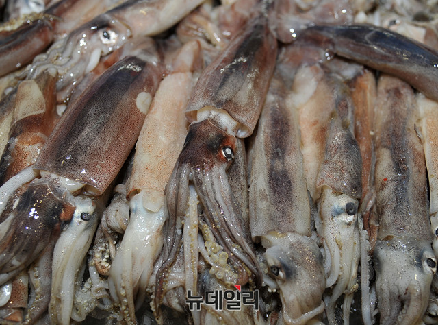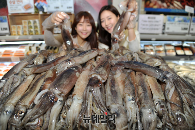 • 롯데마트가 9일 오전 서울 중구 롯데마트 서울역점에서 대서양산 오징어를 선보이고 있다.