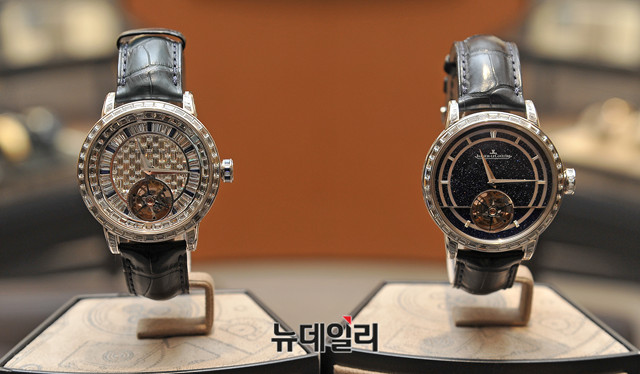 • 스위스 시계 브랜드 '예거 르쿨르트'가 15일 오전 서울 중구 롯데백화점 본점 에비뉴엘에서 6억원대 '마스터 그랑 트래디션 루트비옹(왼쪽)'과 3억원대 '마스터 그랑 트래디션 투르비옹 실린더릭'을 선보이고 있다.