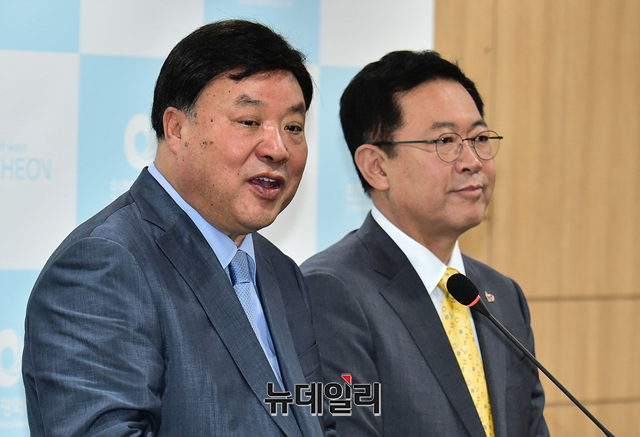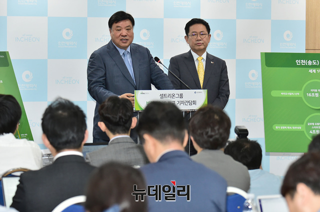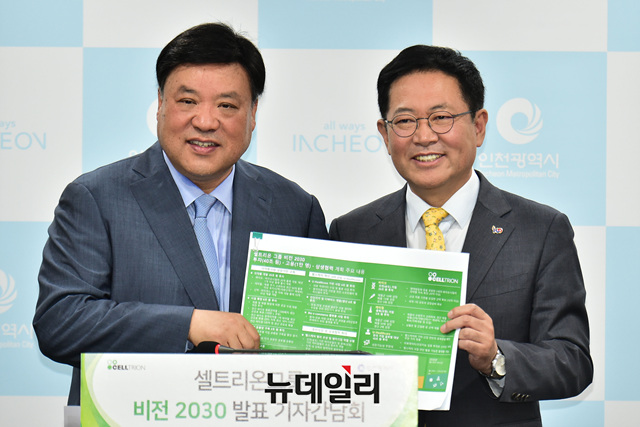 서정진 셀트리온 회장과 박남춘 인천시장이 16일 오전 인천 남동구 인천시청에서 열린 셀트리온그룹 비전 2030 발표 기자간담회에서 투자 자료를 들어 보이고 있다.