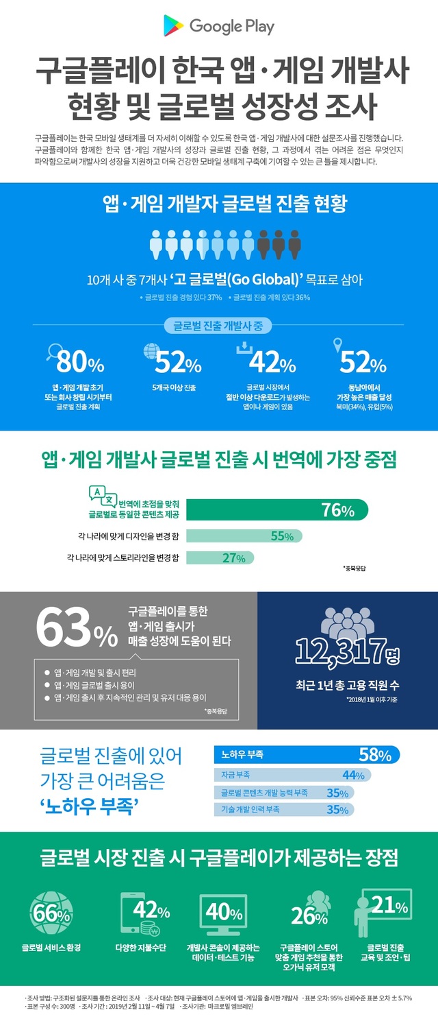 국내 앱·게임 개발사 10곳 중 6곳이 구글플레이를 통해 매출 성장에 도움이 됐다고 응답했다.21일 구글플레이가 조사한 결과에 따르면 '구글플레이를 통한 앱·게임 출시가 매출 성장에 도움이 됐다'고 응답한 업체가 전체 가운데 63%로 집계됐다. 이는 시장조사 업체 마크로밀엠브레인과 함께 국내 앱·게임 개발사 300곳을 대상으로 조사한 결과다.매출 성장에 도움이 된 이유는 ▲ 개발 및 출시의 편리 ▲ 글로벌 출시 용이 ▲ 출시 후 지속적인 관리 및 유저 대응 용이 등 순이었다. 조사 대상 기업의 최근 1년간 고용 직원 수는 총 1만 2317명으로, 개발사 한 곳당 평균 41명의 직원을 신규 채용한 것으로 집계됐다.또한 국내 앱·게임 개발사 10개사 중 7개사(73.3%)가 글로벌 시장 진출을 목표로 삼고 있는 것으로 나타났다. 응답 개발사의 37.3%는 글로벌 시장에 앱과 게임을 출시한 경험이 있고, 36%는 향후 글로벌 시장에 앱과 게임을 출시할 계획이 있다고 답했다.글로벌 시장 진출 경험이 있는 개발사 10개사 중 8개사(80.4%)는 앱·게임 개발 초기 또는 회사 창립 시기부터 글로벌 진출을 계획하는 것으로 파악됐다. 30인 이하의 인디 개발사의 경우 앱·게임 개발 초기 또는 회사 창립 시기부터 글로벌 진출을 계획했다고 답한 비중이 83.6%로 집계됐다.글로벌 시장 진출 시 구글플레이가 제공하는 장점은 ▲글로벌 서비스 환경(66.3%) ▲다양한 지불수단(42%) ▲개발사 콘솔이 제공하는 데이터·테스트 기능(39.3%) ▲구글플레이 맞춤 게임 추천을 통한 오가닉 유저 모객(26%) ▲글로벌 진출 교육 및 조언, 팁(20.7%) 순으로 나타났다.개발사의 고충으로는 '마케팅 등 자금 부족'이라는 응답이 57%(중복 응답)로 가장 많았다. 이어 인력 부족(53%)·개발 및 마케팅 교육 기회 부족(41.3%)·투자자 및 퍼블리셔 인맥 부족(27%)' 등 순으로 집계됐다.개발사 규모가 작을수록 자금 부족 및 인맥 부족에 대한 어려움이 상대적으로 컸고, 큰 개발사는 주로 교육 기회 및 유용한 정보 부족을 애로사항으로 꼽았다.민경환 구글 한국 안드로이드 앱·게임 비즈니스 개발 총괄은 "스타트업과 인디 게임 개발사의 성장 및 글로벌 진출을 위한 실질적인 지원 제공에 최선을 다하겠다"고 말했다.