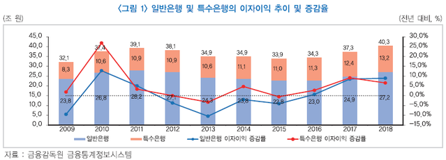 권흥진 연구위원은 “2015년 이후 이자이익 반등은 주로 이자수익 자산의 성장에서 비롯됐다”며 “2017년 국내은행 이자이익 증감 3조원 중 성장성 요인이 1조7000억원, 지난해는 국내은행 이자이익 3조원 중 성장성 요인이 2조4000억원으로 이자이익 반등이 주로 성장성요인에서 유발됐다”고 설명했다.