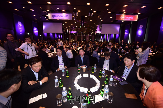 최태원 SK그룹 회장이 28일 오전 서울 광진구 그랜드워커힐 호텔에서 열린 '제1회 SK 소셜밸류커넥트(SOCIAL VALUE CONNECT 2019, SOVAC)'에 참석해 참석자들과 대화를 하고 있다.소셜밸류는 환경 오염, 일자리 부족 등 다양한 사회문제들이 해결된 성과를 말한다.'패러다임 시프트(Paradigm Shift): 사회적 가치의 시대가 온다'라는 주제로 열린 SOVAC은 기업·단체·학계에서 5,000여 명이 참석했다.이날 행사는 △사회성과인센티브(SPC) 어워드 △대학생 대상 ‘소셜 밸류 아이디어 공모전’ 시상식 △사회적기업 창업·투자·상담 등 사회적가치를 체험하는 행사로 열린다.