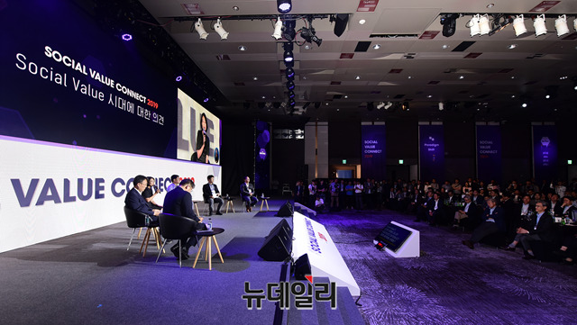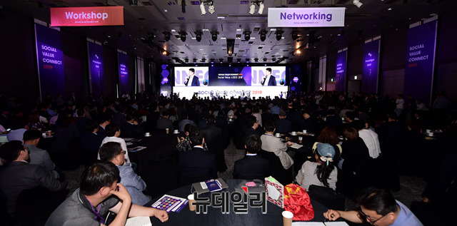 '제1회 SK 소셜밸류커넥트(SOCIAL VALUE CONNECT 2019, SOVAC)'이 28일 오전 서울 광진구 그랜드워커힐 호텔에서 진행되고 있다.소셜밸류는 환경 오염, 일자리 부족 등 다양한 사회문제들이 해결된 성과를 말한다.'패러다임 시프트(Paradigm Shift): 사회적 가치의 시대가 온다'라는 주제로 열린 SOVAC은 애초 2,000명으로 예상했던 것과 달리 기업·단체·학계 등에서 총 5,000여명이 참석했다.이날 행사는 △사회성과인센티브(SPC) 어워드 △대학생 대상 ‘소셜 밸류 아이디어 공모전’ 시상식 △사회적기업 창업·투자·상담 등 사회적가치를 체험하는 행사로 열린다.