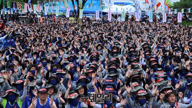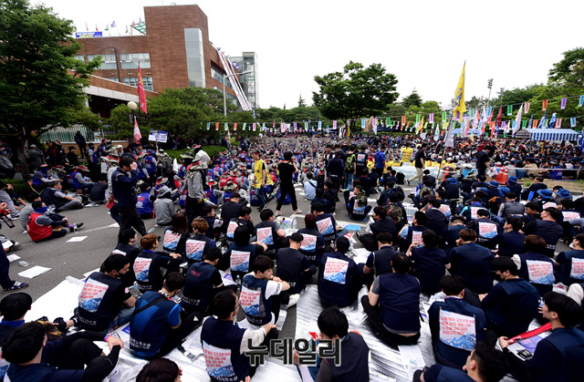 현대중공업 물적분할을 위한 임시주총을 앞둔 30일 오후 울산 동구 한마음회관 앞에서 현대중공업 노조와 민노총 산하 조합원들이 노동자대회를 열고 주총을 반대하는 구호를 외치고 있다. 현재 노조가 주총장을 점거하고 있어 장소 변경 가능성도 제기되고 있는 상황이다. (울산=박성원 기자)