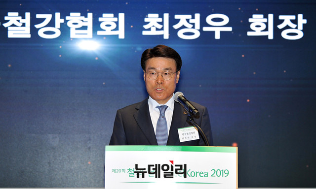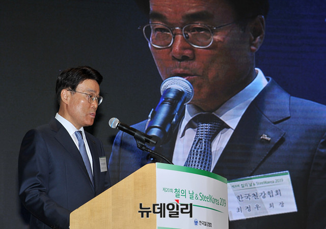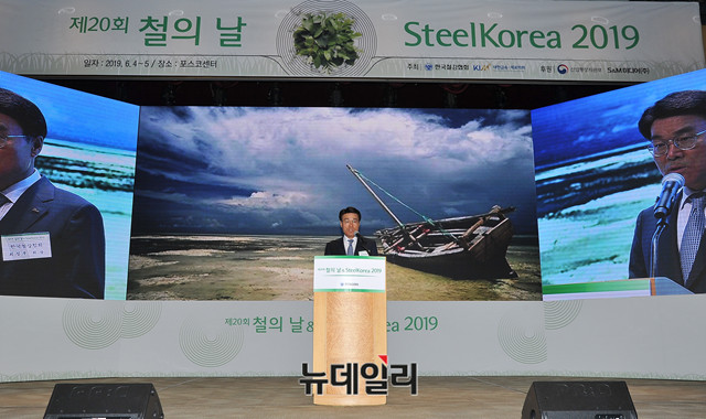 최정우 포스코 회장 겸 한국철강협회 회장이 4일 오전 서울 강남구 포스코센터에서 열린 '제20회 철의 날' 기념식에 참석해 기념사를 하고 있다.이날 행사에는 정승일 산업통상자원부 차관, 최정우 포스코 회장 겸 한국철강협회 회장, 안동일 현대제철 사장, 동국제강 장세욱 부회장, 세아제강 이휘령 부회장, 동부제철 김창수 사장 등 철강업계 및 수요업체 관계자 300여명이 참석했다.한국철강협회는 철강의 중요성을 일반인에게 알리고, 철강인의 화합과 자긍심을 고취하기 위해 우리나라 현대식 용광로에서 처음 쇳물이 생산된 6월 9일을 '철의 날'로 제정했다. 2000년부터 매년 기념행사를 개최하고 있다.