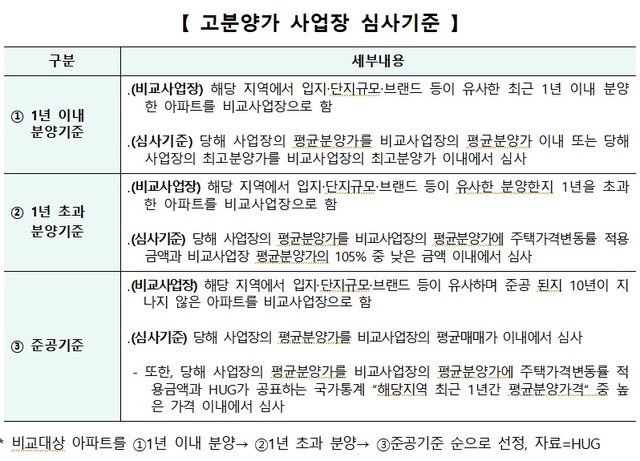 그동안 HUG는 인근 지역(반경 1km 이내 또는 동일 구 내)에서 1년 전 분양된 아파트가 있을 경우 직전 분양 아파트의 분양가를 넘지 못하도록 분양가를 제한하고 1년 전에 분양한 아파트가 없는 경우에는 직전 분양가의 최대 110%까지 인상을 허용한다는 규정이 있었다.