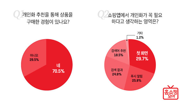 홈쇼핑모아를 운영하는 버즈니는 설문조사를 통해 모바일 쇼핑을 이용한 이용자 70.5%가 개인화 추천을 통해 상품을 구매했다고 13일 발표했다.개인화 추천으로 구매한 상품은 '패션·잡화'가 25.3%로 가장 많았다. 이어 '화장품(21.4%)', '식품·건강(21%)', '생활·주방 용품(17.8%)', '디지털·가전(6.6%)', '가구·인테리어 (3%)', '기타(4.9%)' 순이었다.평소 개인화 추천 서비스에 대해서는 '있으면 좋다(50.5%)'와 '매우 유용하다(42%)'는 긍정적인 의견이 전체의 92.5%를 차지해 높은 만족도를 보였다. 불필요하다는 의견은 7.5%였다.쇼핑앱에서 개인화가 꼭 필요하다고 생각하는 영역은 '첫 화면(29.7%)'이 꼽혔다. 이어 '푸시 알림(25.8%)', '검색 결과(24.8%)', '검색어 추천(18.5%)', 기타(1.2%) 순으로 개인화가 필요하다고 답했다.이번 설문 조사는 지난달 27일부터 이달 3일까지 진행됐다. 여성(83%) 참여자가 대부분을 차지했고, 연령대는 20대 이하(9%), 30대(34%), 40대(36%), 50대 이상(21%) 등 이었다.