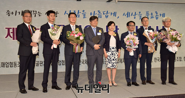 제경희 산업통상자원부 섬유화학탄소과 과장과 산업부장관 수상자들이 14일 오전 서울 종로구 세종문화회관 세종홀에서 열린 '제3회 종이의 날' 기념행사에서 기념촬영을 하고 있다.'종이의 날'은 국내에서 처음 현대식 초지기(연속적으로 종이를 만드는 기계)를 사용해 종이를 양산해낸 날이 1902년 6월 16일이라는 점을 기념해 제지업계가 6월 16일로 공식 지정했다.