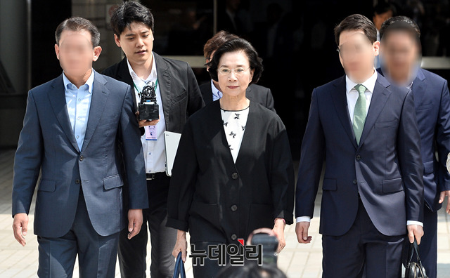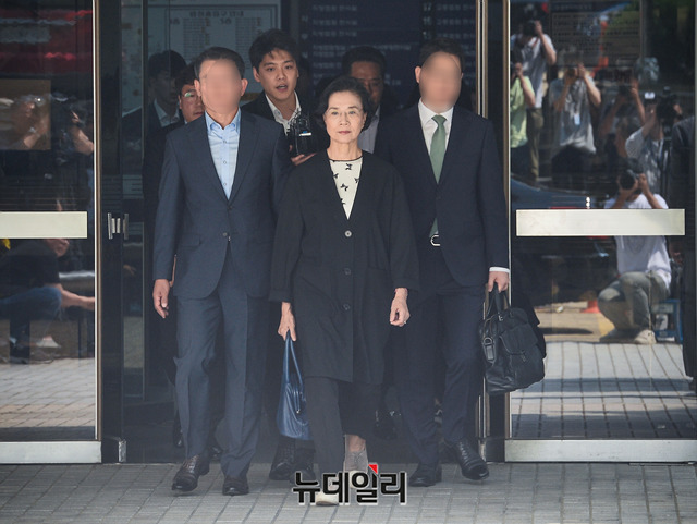 필리핀 여성 가사도우미를 불법 고용한 혐의를 받는 이명희 전 일우재단 이사장이 2일 오후 서울 서초구 서울중앙지방법원에서 열린 1심 선고공판을 마치고 법정을 나서고 있다.