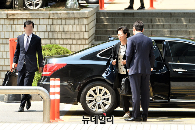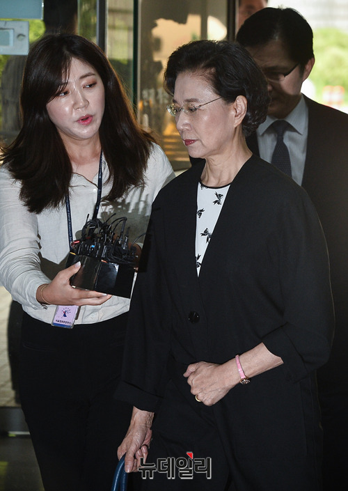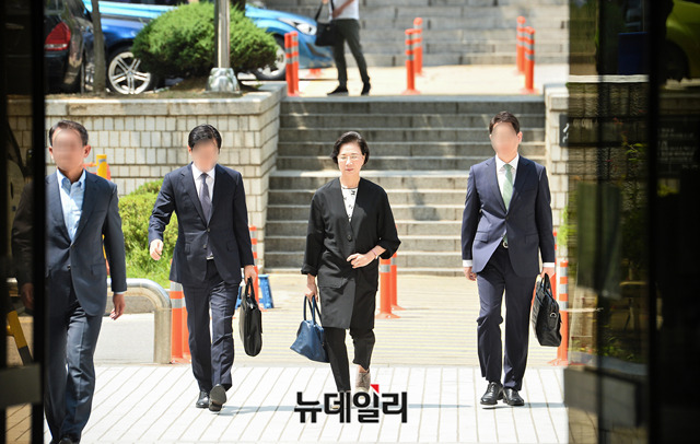 필리핀 여성 6명을 가사도우미로 불법 고용한 혐의를 받는 이명희 전 일우재단 이사장이 2일 오후 서울 서초구 서울중앙지방법원에서 열린 1심 선고공판에 출석하고 있다.
