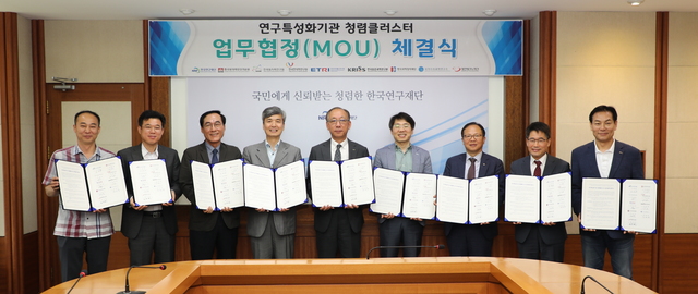 과학기술정보통신부 산하 9개 연구특성화기관이 3일 한국연구재단 대전청사에서 반부패‧청렴정책 추진 및 제도개선 시 상호협력을 위한 업무협약(MOU)을 체결했다.9개 연구특성화기관은 한국연구재단과 한국원자력안전기술원(KINS), 한국원자력연구원(KAERI), 한국한의학연구원(KIOM), 한국전자통신연구원(ETRI), 한국표준과학연구원(KRISS), 한국과학창의재단(KOFAC), 국가수리과학연구소(NIMS), 대전테크노파크(DJTP) 등이다.협약에 따라 연구재단과 KINS 등 9개 기관은 반부패‧청렴정책 공동추진 및 제도 개선 시 상호협력을 비롯해 청렴정책 우수사례 공유 등에 상호 협력을 강화하기로 했다.9개 기관은 반부패‧청렴정책의 시너지 제고를 위해 ▲연구비 집행관리와 관련된 제도개선 사항의 연구현장 적용 애로요인 파악 및 제도개선 아이디어 발굴을 위해 상호 협력 ▲정기회의(분기별 1회 이상)를 통한 청렴정책 우수사례 등 정보 공유를 위해 상호 협력 ▲청렴캠페인, 교육, 연구조사, 간담회 등의 행사 공동 추진을 위해 상호 협력 ▲실무협의체의 실질적 운영을 통해 지속가능한 청렴정책 추진에 힘을 모을 예정이다.이재력 연구재단 감사는 "지금까지 대전 연구단지 기관위주의 청렴활동을 탈피하여 전국 단위의 반부패‧청렴 정책 추진의 발판이 마련됐다"며 "실질적 청렴문화 확산 활동을 추진하도록 노력 하겠다"고 말했다.