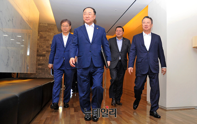 • 홍남기 부총리 겸 기획재정부 장관과 박용만 대한상공회의소 회장을 비롯한 주요 대기업 대표 및 전국 상회의소 회장단이 4일 오후 서울 중구 대한상공회의소에서 열린 '하반기 경제정책방향 기업인 간담회'에 참석하고 있다.