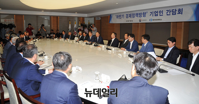 • 홍남기 부총리 겸 기획재정부 장관과 박용만 대한상공회의소 회장을 비롯한 주요 대기업 대표 및 전국 상회의소 회장단이 4일 오후 서울 중구 대한상공회의소에서 열린 '하반기 경제정책방향 기업인 간담회'에 참석해 기념촬영을 하고 있다.