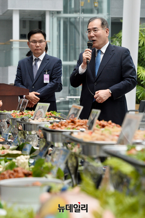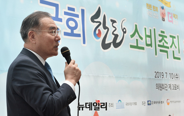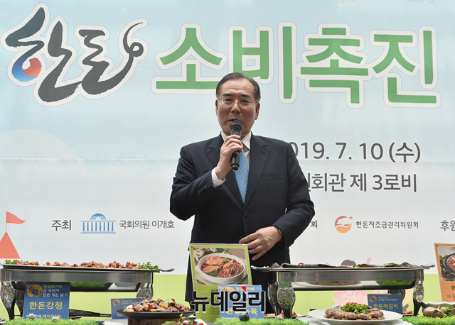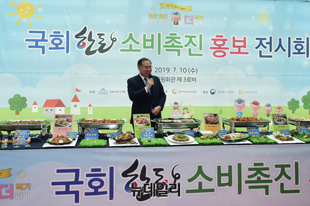 이개호 농림축산식품부 장관이 10일 오전 국회 의원회관에서 열린 '국회 한돈 소비촉진 홍보 전시회'에서 인사말을 하고 있다. 이번 전시회는 최근 한돈 소비 부진으로 인한 가격폭락을 막고자 한돈자조금이 준비했다. 전시회에는 기획세트 주문접수와 한돈요리 시식행사가 진행됐다.