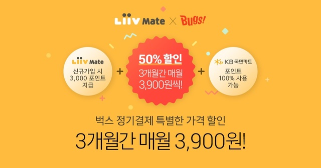 NHN벅스는 KB국민카드와 제휴를 맺고, 리브메이트 이용자에게 벅스 음악 듣기 이용권을 3개월간 약 50% 할인해 제공한다고 10일 밝혔다.양사의 할인 프로모션은 앞으로 1년간 KB금융그룹의 통합 멤버십 플랫폼인 '리브메이트(Liiv Mate)' 가입자를 대상으로 한다. 리브메이트 앱 내 프로모션 페이지를 통해 벅스의 '듣기' 음악 이용권(정상가 7900원, VAT 별도)’을 자동결제 하면 첫 3개월 간 절반 가격인 월 3900원에 이용할 수 있다.리브메이트 신규 가입자라면 첫 달 900원까지 할인 폭이 늘어난다. 리브메이트 가입 시 프로모션 코드에 벅스를 입력하면 3000 포인트를 지급한다. 해당 포인트는 벅스 음악 듣기 이용권 자동결제 시 함께 사용할 수 있다.