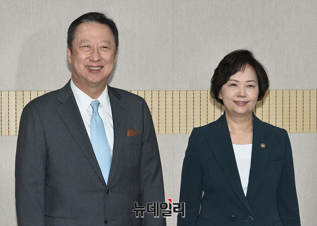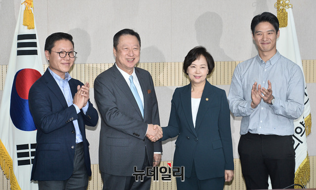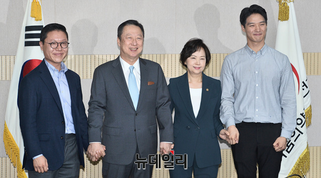 박용만 대한상공회의소 회장이 15일 오후 서울 양천구 서울지방식품의약품안전청을 방문해 기념촬영을 하고 있다. (왼쪽부터 김기웅 심플프로젝트컴퍼니 대표, 박용만 대한상의 회장, 이의경 식약처장, 양승만 그래잇 대표)