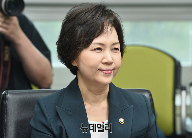 이의경 식품의약품안전처 처장이 15일 오후 서울 양천구 서울지방식품의약품안전청을 방문한 박용만 대한상공회의소 회장의 발언을 듣고 있다.