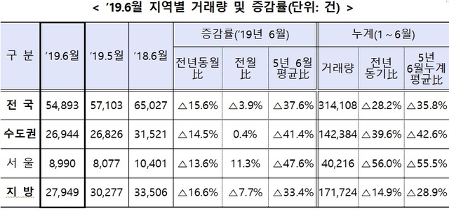 올 상반기 주택 매매거래량이 평년 대비 30% 이상 감소하며 '거래절벽' 현상이 이어진 것으로 나타났다. 반면 전월세 거래량은 늘었다.
