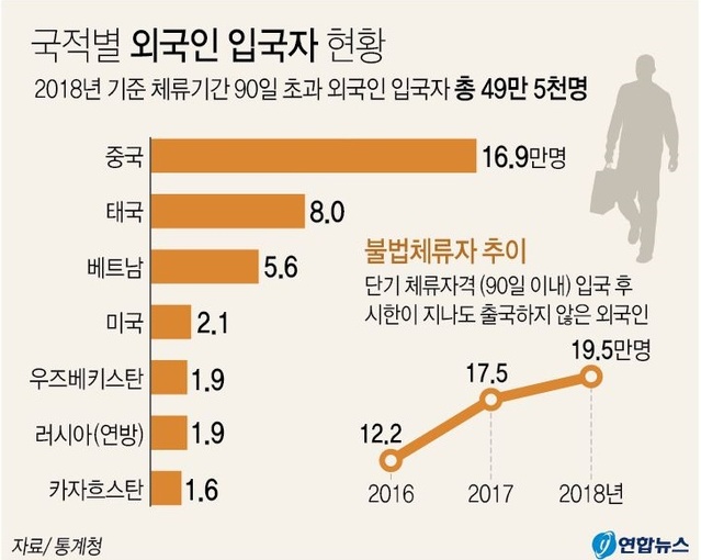 태국은 비자 없이 입국할 수 있는 사증 면제 협정 국가로 지난해 사증 면제로 8천명이 입국했다. 단 작년 태국인 입국자의 90.9%는 90일까지만 체류할 수 있는 비자였는데 출국하지 않아 불법체류 신분인 것으로 분석됐다.