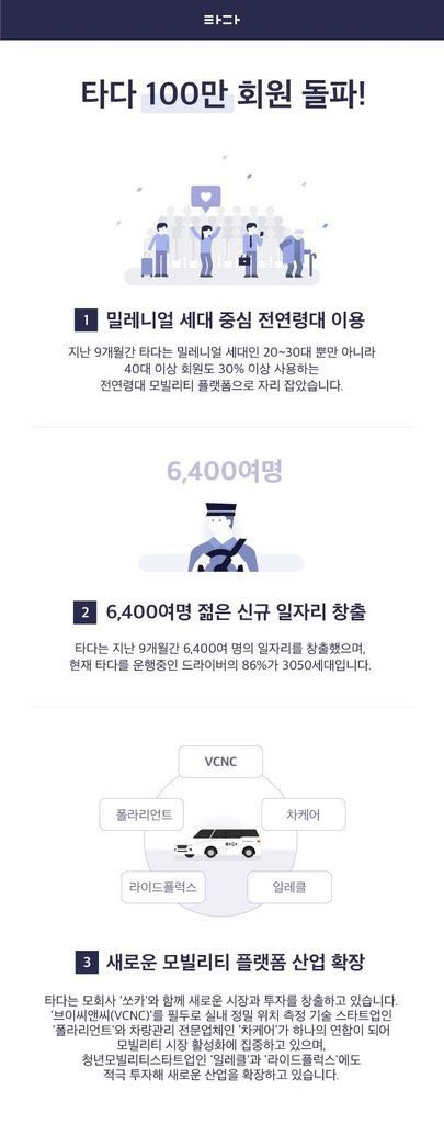모빌리티 플랫폼 타다가 서비스 시작 9개월 만에 이용자 100만명을 기록했다.24일 타다에 따르면 이용자는 20~30대가 전체의 68%였으며 40대 이상은 9개월 전 19%에서 지난달 기준31%로 증가추세를 보였다. 남녀비율은 남성이 56%, 여성이 44%로 나타났다.타다는 젊은 세대 중심의 새로운 일자리를 창출하는 플랫폼으로 성과를 만들었다. 타다는 지난 9개월간 6400여 명의 일자리를 창출했으며, 현재 타다를 운행 중인 드라이버의 86%가 3050세대다.또한 타다는 모회사 '쏘카'와 함께 새로운 시장을 창출해 국내외 투자사들로부터 1100억원의 투자를 유치했다. 모빌리티 시장 활성화를 위해 '브이씨앤씨(VCNC)'를 필두로 실내 정밀 위치 측정 기술 스타트업인 '폴라리언트'와 차량 관리 전문업체인 '차케어'를 인수하기도 했다.타다는 이용자 100만 돌파를 기념해 오는 26일까지 이용자 대상 무료탑승이벤트를 진행한다. 100만 회원 돌파 기념 전용 차량을 운영하며 타다 베이직 호출 시 랜덤으로 당첨된다.