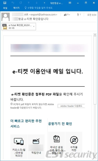 무더위와 함께 본격적인 여름 휴가철이 시작되면서 '사이버 보안'에 대한 위협도 고조되고 있다. 인터넷 사용량 급증에 따른 악성 메일·랜섬웨어·스미싱 등 각종 '사이버 공격'에 대한 각별한 주의가 요구된다.29일 관련 업계에 따르면 '7말 8초'라 불리는 황금 휴가 기간을 노린 해킹 공격이 활발하게 전개될 전망이다. 스마트폰과 인터넷의 정보 검색을 악용한 피해를 입게될 위험이 높다.가령 국내외로 여행을 떠나는 '여행족'들을 대상으로는 ▲기차표 ▲항공권 ▲숙박예약 등을 악용한 악성코드 공격이 전개될 것으로 보인다. 이스트시큐리티 시큐리티대응센터(ESRC)는 국내 항공사의 '전자 항공권 티켓(e-티켓)' 확인증으로 위장한 해킹 이메일이 다수 유포되고 있다고 진단했다.가령 악성 이메일에는 'e-Ticket 확인증_95291015.iso' 파일명의 압축 파일이 첨부되어 있다. 압축을 해제하면 아이콘과 확장자명을 PDF 문서로 위장한 'e-Ticket 확인증_66016630.pdf.scr' 파일이 나타나며, 이를 실행할 경우 감염이 되는 구조다.공격자가 와이파이를 개설해놓고 접속하는 기기를 노리는 경우도 있다. 여행지에서 공개 와이파이에 연결된 스마트폰, 노트북 등으로는 금융거래를 할 경우 비밀번호와 개인정보가 탈취될 수 있다.집이나 호텔 등에서 휴가를 즐기는 '홈캉스'도 예외는 아니다. 토렌트나 파일 공유 사이트를 중심으로 유명 콘텐츠(동영상, 게임, 만화 등)를 사칭해 악성코드를 유포할 가능성이 높기 때문이다.기업의 경우 담당자가 장기간 자리를 비어있는 점을 이용해 웹사이트에 '랜섬웨어'를 심어두는 사례도 빈번히 발생한다. 랜섬웨어는 컴퓨터 안에 들어있는 파일들을 순식간에 암호화하고 돈을 요구하는 대표적인 악성코드로 그 수법이 날로 지능화되고 있다.한국인터넷진흥원(KISA)에 따르면 사이버 공격 91%가 해킹 메일로 시작된다고 경고한다. 글로벌 보안업체 파이어아이도 해킹 메일에 사용된 첨부파일 99.7%는 '사회공학적 기법'을 이용하고 있다고 진단했다.사회공학적 해킹은 개인 및 심리 상태 등의 정보를 빼내는 것으로, 공공기관 또는 지인을 사칭해 개인 정보를 요구하는 '피싱(phishing)'이 대표적인 케이스다. 외국인 해커가 유창한 한글로 현혹한 악성 이메일을 유포하는 것도 비슷한 수법이다.박진완 KISA 종합대응팀장은 "미국 연방정부의 경우 해킹 피해를 막기 위해 도메인 기반 이메일 인증(DMARC), 메일서버 등록제(SPF), 도메인 키 인증 메일(DKIM) 등을 권고하고 있다"며 "국내에서도 관계부처 합동으로 대응에 나서야 할 것"이라고 제언했다.