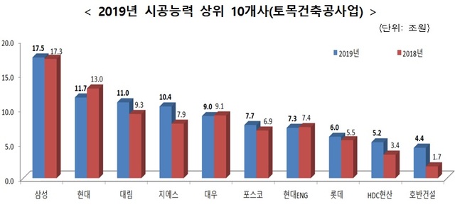 삼성물산이 시공능력평가에서 6년 연속 1위를 차지했다. 한편 호반건설은 '빅10'에 처음으로 진입했다.