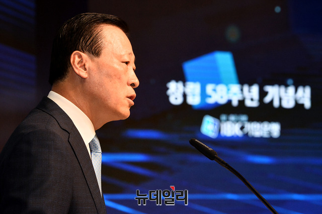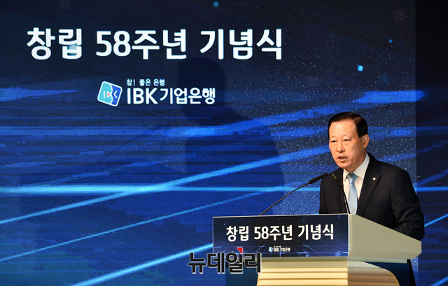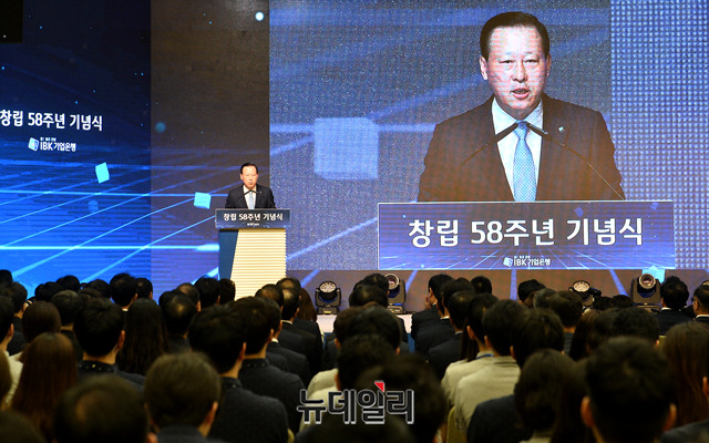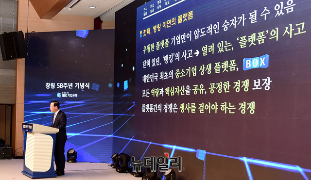 김도진 기업은행장이 1일 오전 서울 중구 기업은행 을지로 본점에서 열린 기업은행 창립 58주년 기념식에서 창립기념사를 하고 있다.김 행장은 "기업은행의 역할과 존재가치는 장기적인 안목으로 중소기업과 함께 성장하는 것"이라며 "IBK BOX(박스)를 통해 중소기업이 인력, 정보력, 자금력의 열세를 극복하고 도약의 토대를 구축하는 최적의 기회를 제공하겠다"고 밝혔다.'IBK BOX'는 'Business Operation eXpert(기업 경영지원 전문가)'의 줄임말로 국내 금융권 최초로 중소기업 경영 지원 솔루션 앱이다. 이날 기념식에는 김도진 은행장과 임직원 300명이 참석했다.