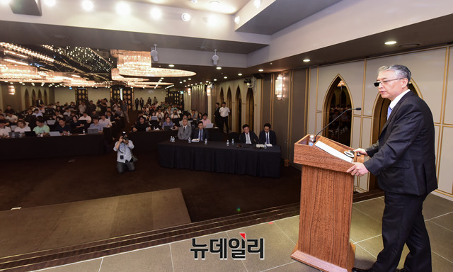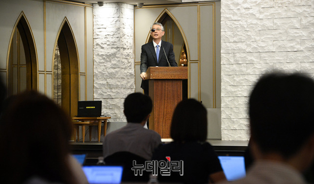 문은상 신라젠 대표가 4일 오후 서울 영등포구 CCMM빌딩에서 열린 '펙사벡' 글로벌 임상 3상 무용성 평가 관련 긴급 간담회에서 발언하고 있다.