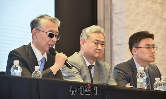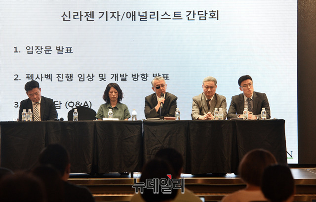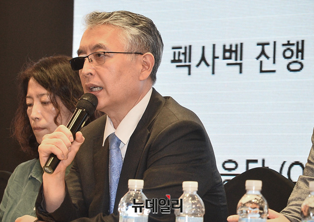 문은상 신라젠 대표가 4일 오후 서울 영등포구 CCMM빌딩에서 열린 '펙사벡' 글로벌 임상 3상 무용성 평가 관련 긴급 간담회에서 기자들의 질문에 답하고 있다.
